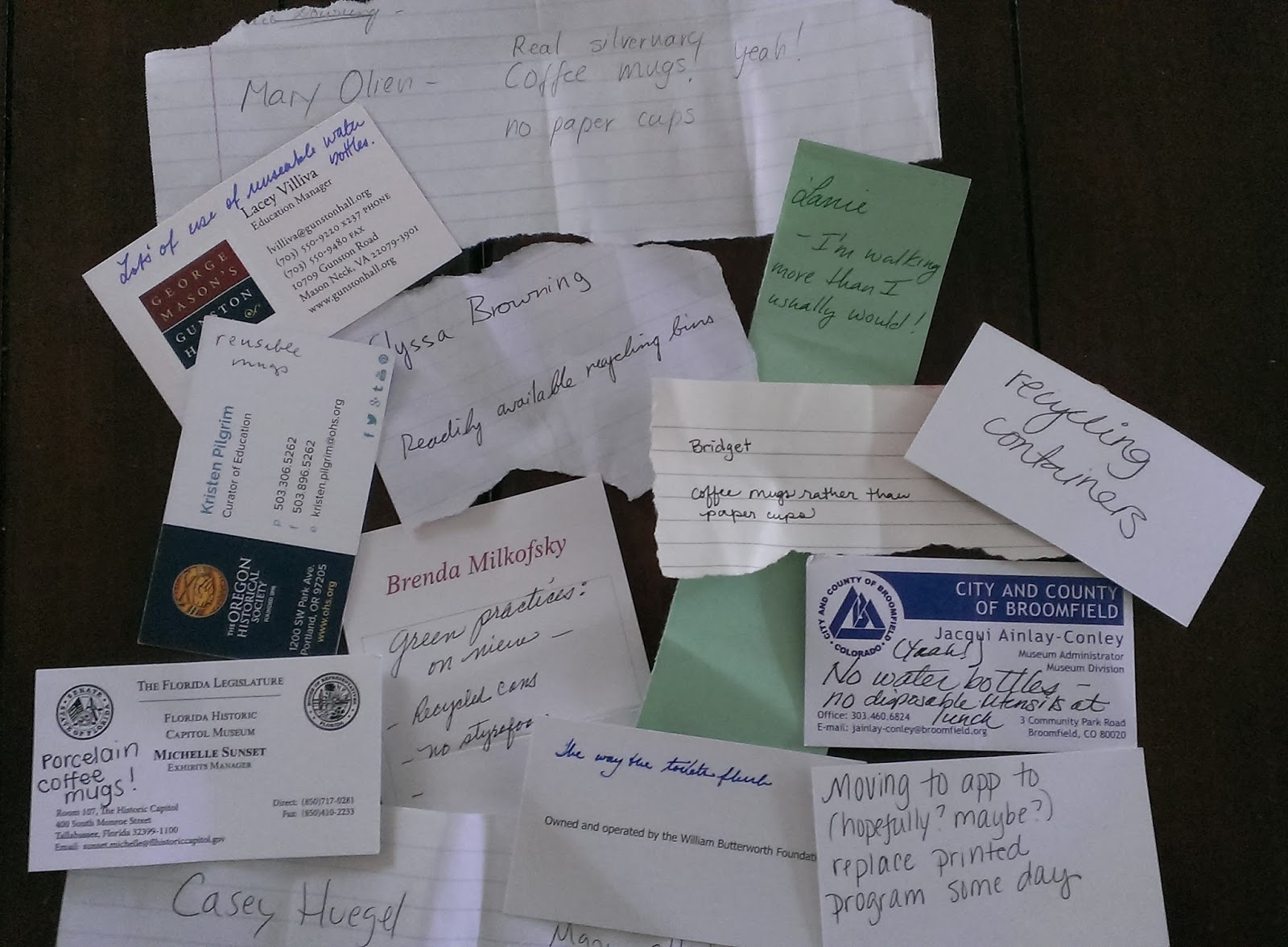 In our session I tested our group's observation skills. I invited them to enter the raffle for two free copies of Environmental Sustainability at Historic Sites and Museums by writing down (on reused paper) what green practices they had noticed at the 2017 AASLH conference. The attendees were impressed with what they'd seen AND they suggested I share that with others to give AASLH credit. I agree. Let's share the good work wherever we can. Here's what we saw: